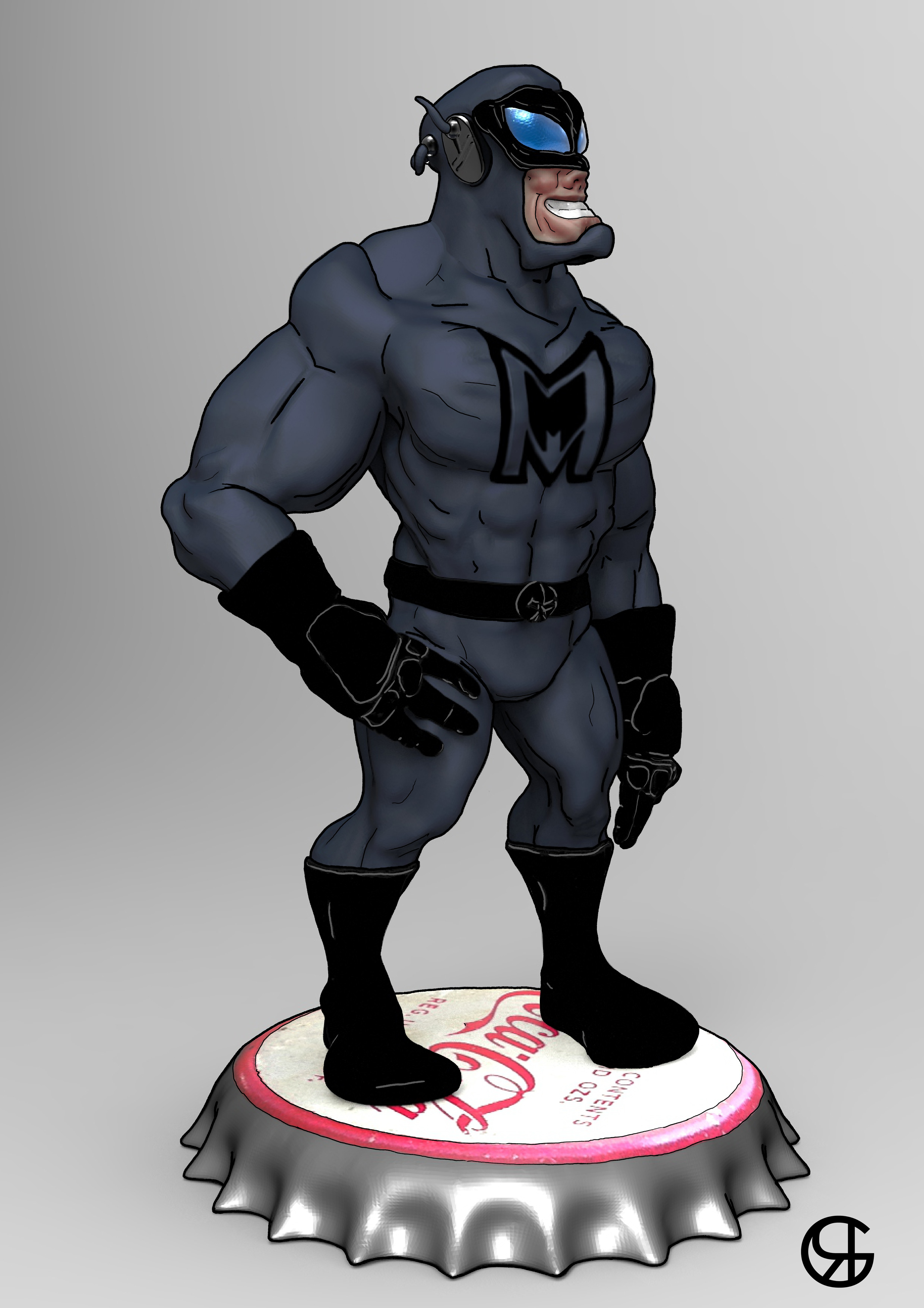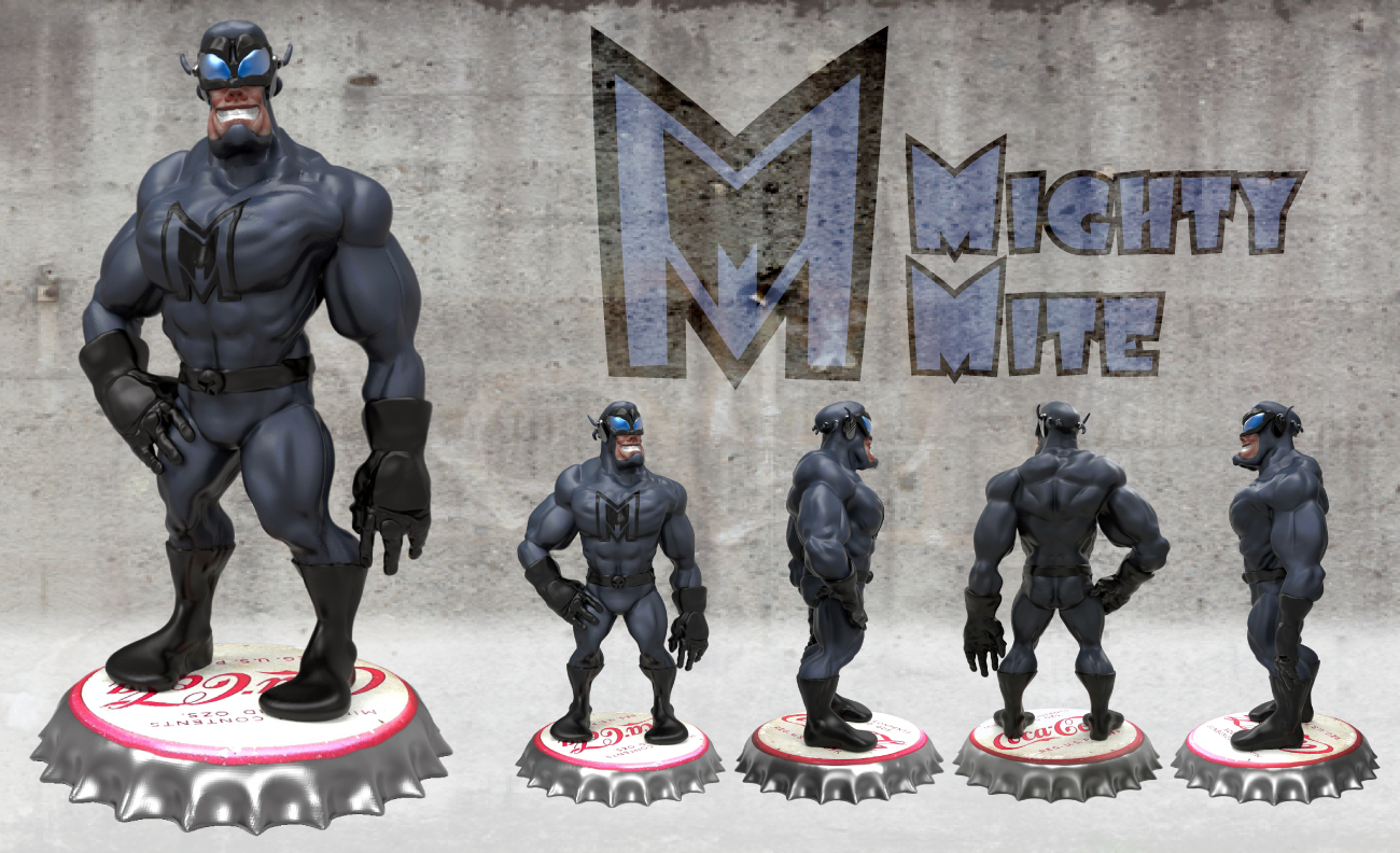 This was a personal project . My goal was to develop a full character in a classic comic parody style. He is a hero who is long on muscle and heart. In the inexplicable, yet long-standing tradition of naming heroes after icky bugs, I present… Mighty Mite!